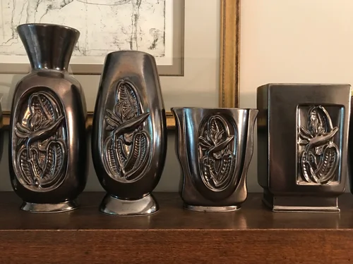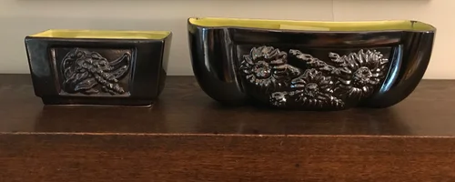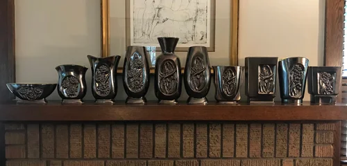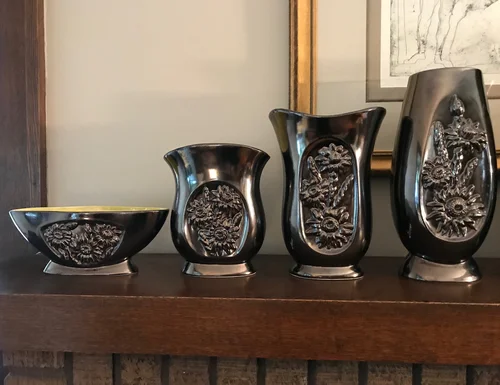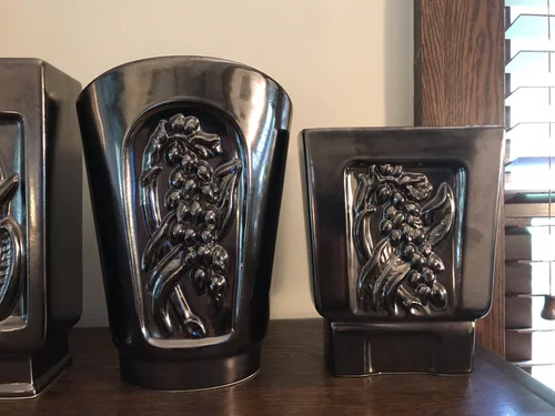 This almost complete grouping was collected by a dear friend and is no longer together. This line was designed by Belle Kogan for Red Wing Pottery and first released in 1950. There are 3 decorative designs that mix and match on various-shaped vases and console bowls. All are glazed in a beautiful metallic color called Mica Bronze and lined in a chartreuse green called Citron. See close ups below.